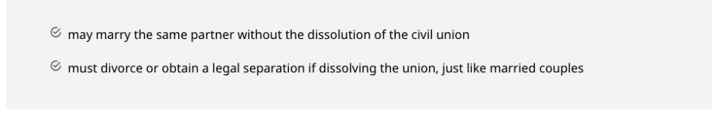 [checkmark]<li>may marry the same partner without the dissolution of the civil union</li>[/checkmark]