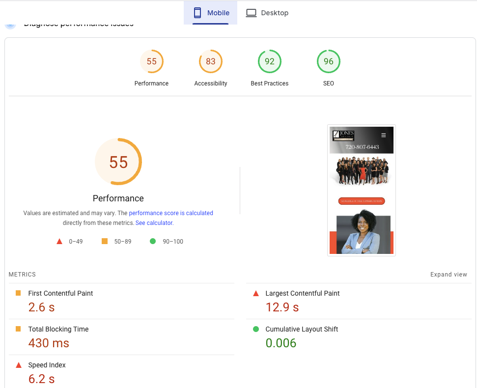 - 5hrs – Performance testing & modifications was able to bring the page from 55/83/92/96 to a 94/85/100/96 https://docs.apriljoneslaw.com/docs/baseline-testing/spiffy-2-1/